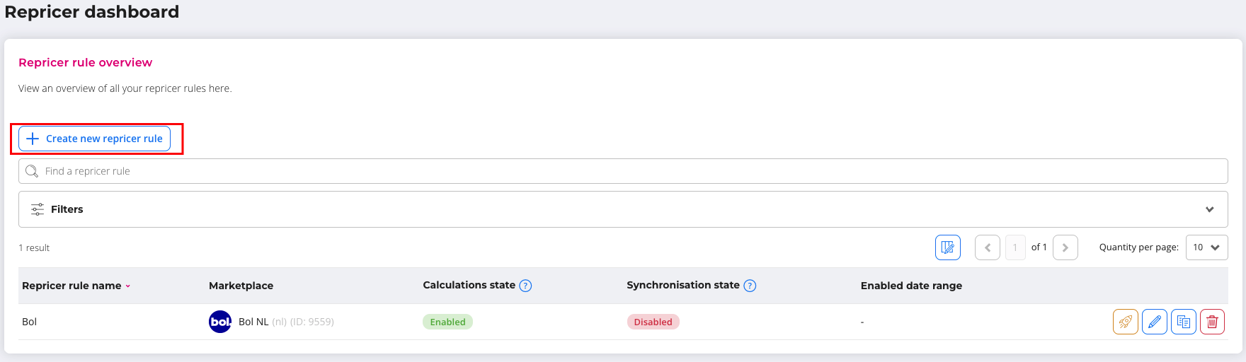 The Repricer Dashboard is the overview page of the repricer. On the Repricer Dashboard, you can create new repricing rules and view certain logs.