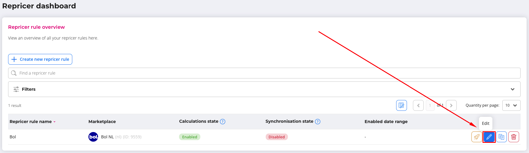 To edit a repricer rule, click the 'pencil' icon in the overview. A page will then open where all settings of that specific repricer rule can be adjusted.