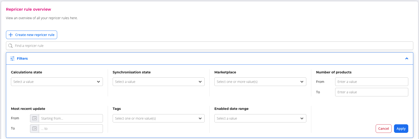 Within the overview of repricer rules, you can filter by various rule properties. By selecting a value from the dropdowns or specifying a date/product range and clicking 'Apply', only the rules that match the filter criteria will be displayed.