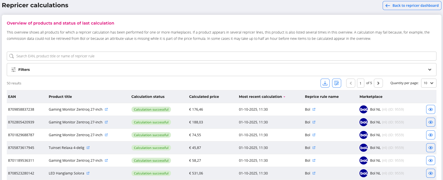 In the calculations overview, you can search by SKU or EAN. At the end of each row, specific product logging can be viewed by clicking the 'eye' icon, which will open a slide-out panel.