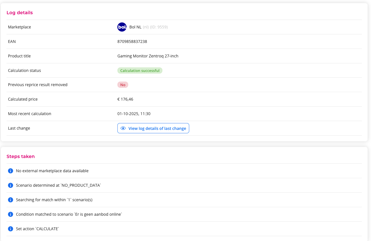 Within the details, you can see the calculated price, when the most recent calculation took place, and a log of the last change. The difference between the most recent calculation and the most recent change is as follows: