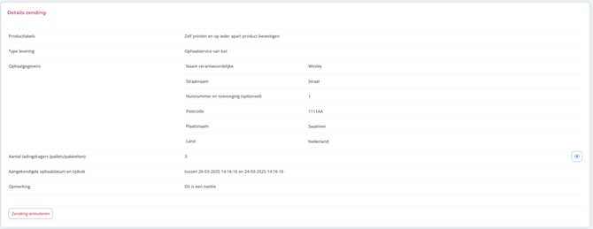 Displays detailed information about the shipment, with the option to cancel (depending on status).