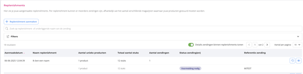 In the replenishments overview, you will see a complete list of current and previous replenishment actions. Here, you can enable or disable the ‘show shipment details within replenishments’ switch or apply filters as needed.