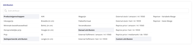 In de repricer is het mogelijk om binnen de formule builder direct een bestaand attribuut in EffectConnect aan te klikken en te gebruiken in je formules. De inkoopprijs van je producten is bijvoorbeeld in deze attributen lijst terug te vinden en te selecteren voor gebruik in je formules. Je kunt ook via de zoekfunctie een specifiek attribuut opzoeken: