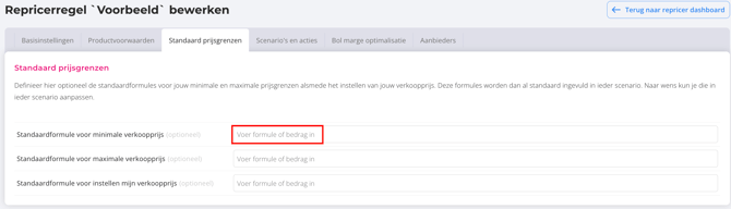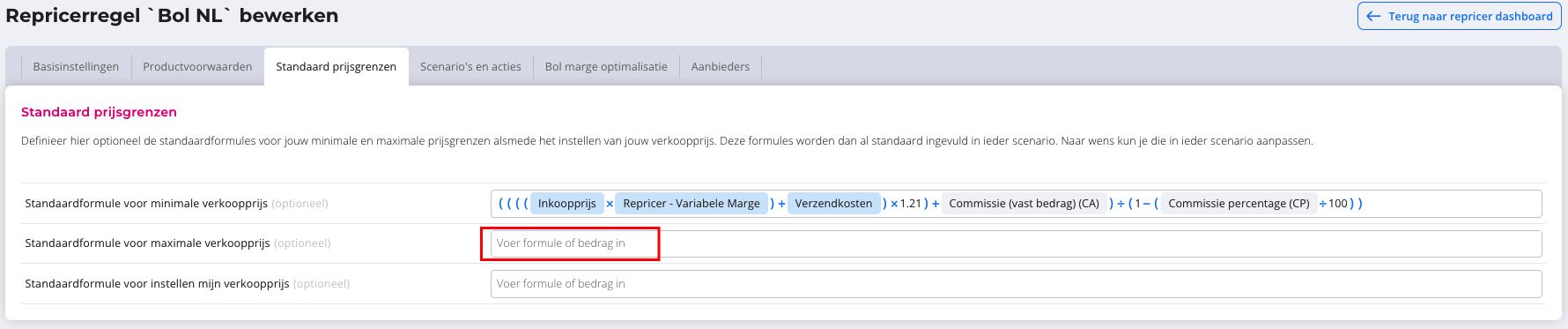 We nemen de formules onder het tabblad 'standaard prijsgrenzen' als voorbeeld, de invoer van formules op andere plekken in de repricer werkt exact hetzelfde.