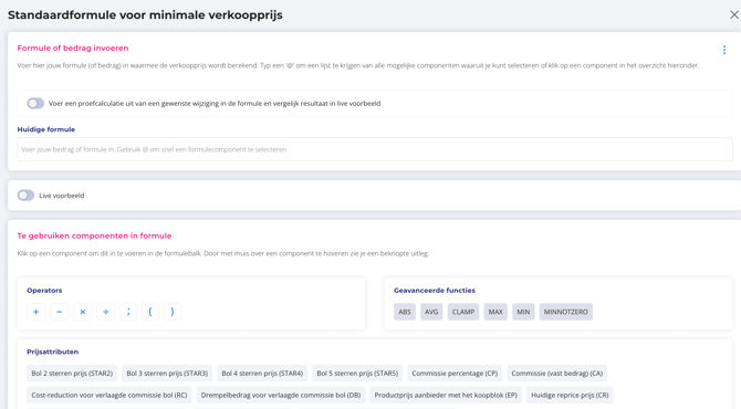 De formule builder zijn de pagina's binnen repriceregels waarin je een minimale of maximale prijsformule kunt invoeren of een actie formule kunt invoeren waarmee je prijs zou moeten veranderen in een specifiek scenario. In dit artikel leggen we de werking van de formule builder uit en geven we een uitleg van verschillende functies in de formule builder.