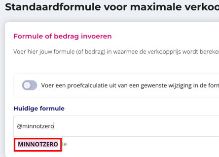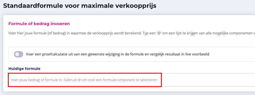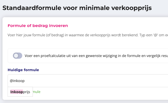 Je kunt in dit veld bijvoorbeeld attributen of componenten selecteren door @ te typen en vervolgens een gedeelte van het attribuut of component in te voeren. Bijvoorbeeld @inkoopprijs: