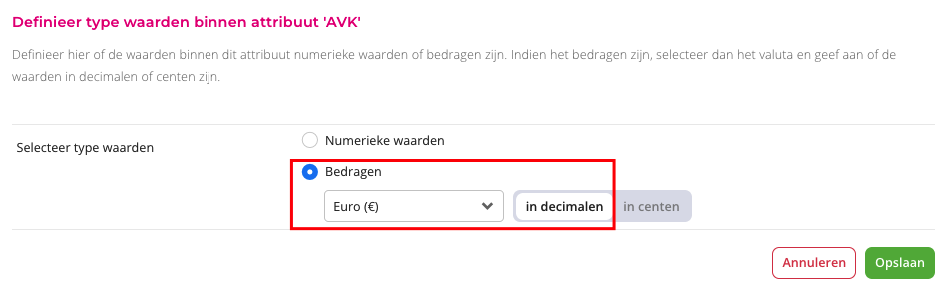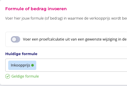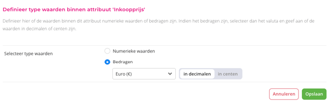 In dit voorbeeld zit er een bedrag in decimalen in het attribuut inkoopprijs. Heb je attributen in eurocenten in je catalogus zitten? Zet deze instelling dan op 'in centen', de repricer zet dit dan automatisch om in de calculaties. Heb je een attribuut om bijvoorbeeld een BTW percentage aan te geven waar 1.21 of 1.09 als waarde in zit? Gebruik dan de optie 'numerieke waarde'.