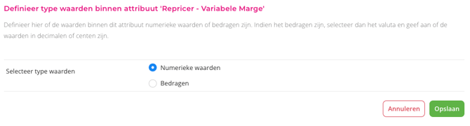 Het attribuut 'Repricer - Variabele Marge' stellen we in als 'numerieke waarden':