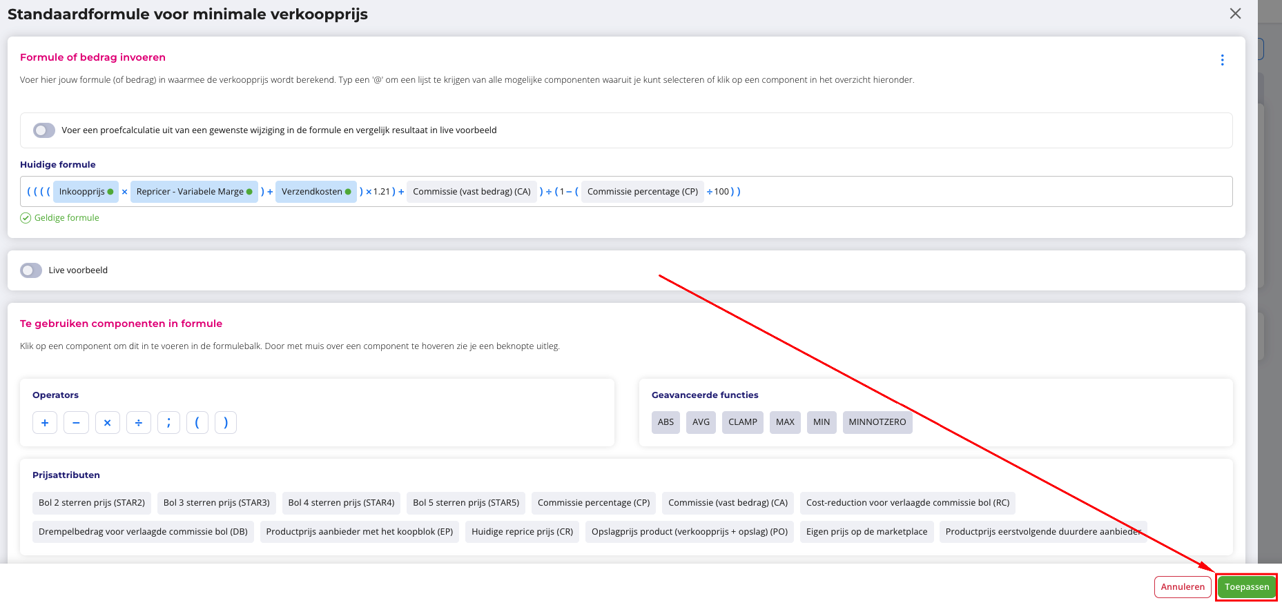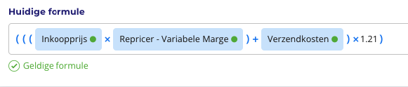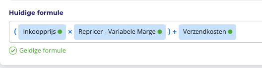 We hebben nu een basisformule ingevoerd voor de minimale verkoopprijs. Op de achtergrond zal op de ingevoerde attributen op ieder product in de productselectie welke aan de repriceregel is gekoppeld, de juiste waarde gepakt worden die op een specifiek product op de inkoopprijs, marge, verzendkosten ed. hoort. Zo wordt er in bulk op ieder product de juiste calculatie uitgevoerd met de individuele datapunten.