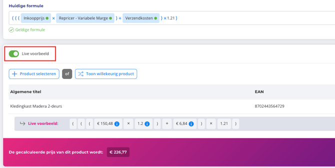 Wil je tussendoor zien hoe de formule eruit zal zien met gevulde waarden? Schakel dan het live voorbeeld in: