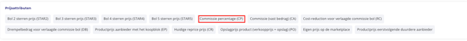 Als laatste voegen we ook de variabele commissie toe, het commissie percentage. Hiervoor voegen typen we eerst /(1-( in de formule balk en klikken we daarna op 'commissie percentage (CP)' in de prijsattributen lijst: