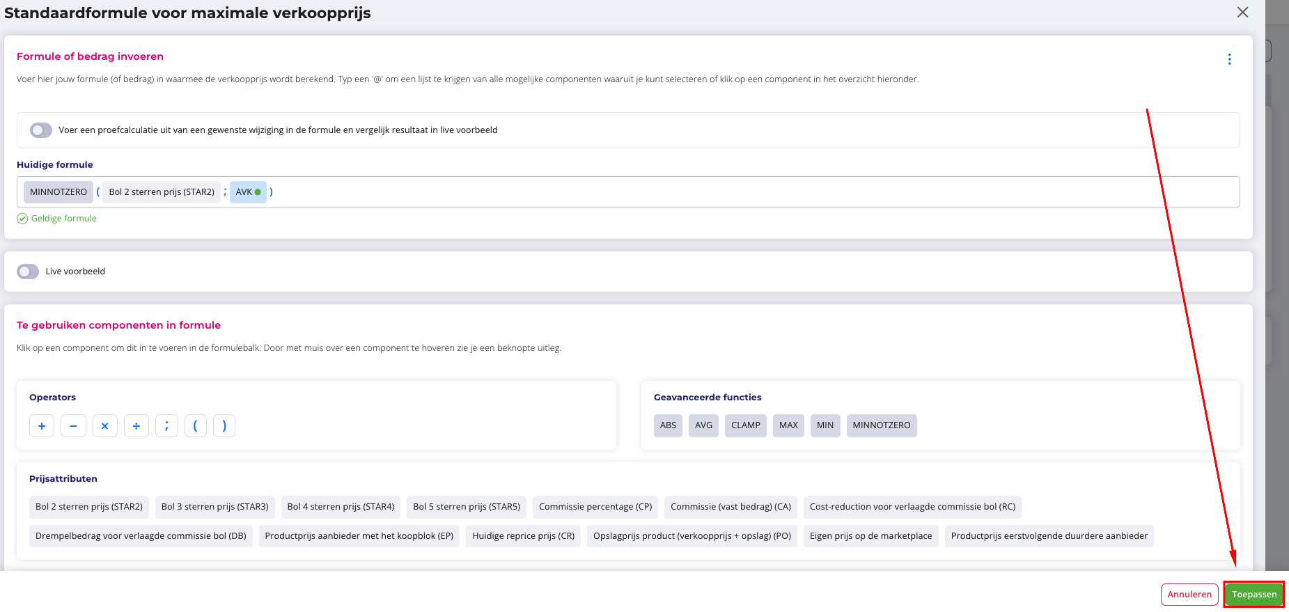 Er opent een nieuw scherm met de formule builder voor de maximale verkoopprijs. In dit voorbeeld kiezen we voor een geïmporteerd prijsattribuut met de advies verkoopprijs. De advies verkoopprijs willen we daarbij vergelijken met de 2 sterrenprijs van Bol, zo blijft het artikel online getoond staan indien de 2 sterrenprijs van Bol lager is dan de advies verkoopprijs. Indien de adviesverkoopprijs lager is dan de 2 sterrenprijs, dan willen we dat als maximale prijs hanteren.