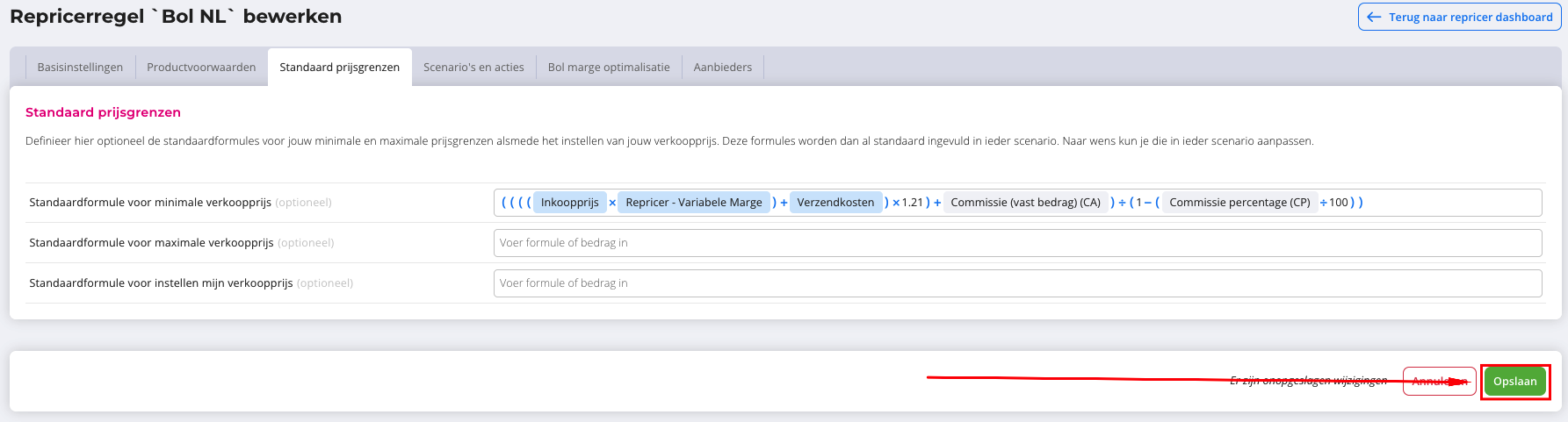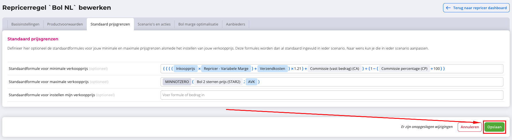 Klik in het daaropvolgende scherm op opslaan om de aanpassing in de repriceregel ook op te slaan:
