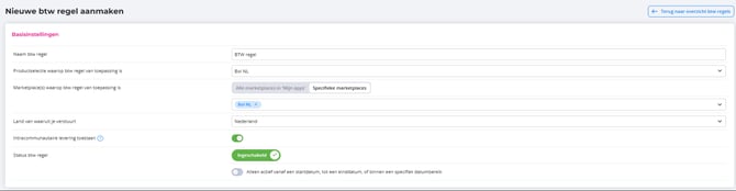 Binnen de module maak je regels aan op basis van productselectie, marketplace(s), verzendland en eventueel intracommunautaire levering: