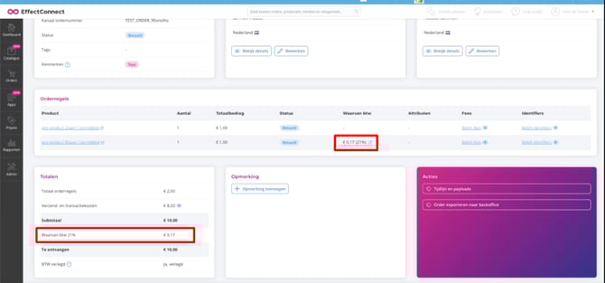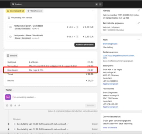 EffectConnect exporteert vervolgens de btw-informatie voor elke order naar Shopify, zodat Shopify automatisch het juiste btw-percentage toepast.